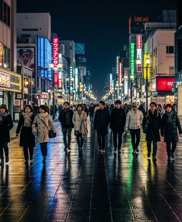 街のネオンが冬の入口で濃度を増し、路面に映る光は水彩のような柔らかさを帯びる。