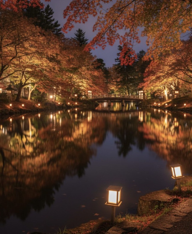 札幌市中央区・中島公園では、11月3日まで紅葉ライトアップを開催中。日本庭園や豊平館周辺が照らされ、池に映る紅葉は幻想的。和傘や竹あかりの演出もあり、観光客だけでなく地元市民も夜の散歩がてら立ち寄っています。