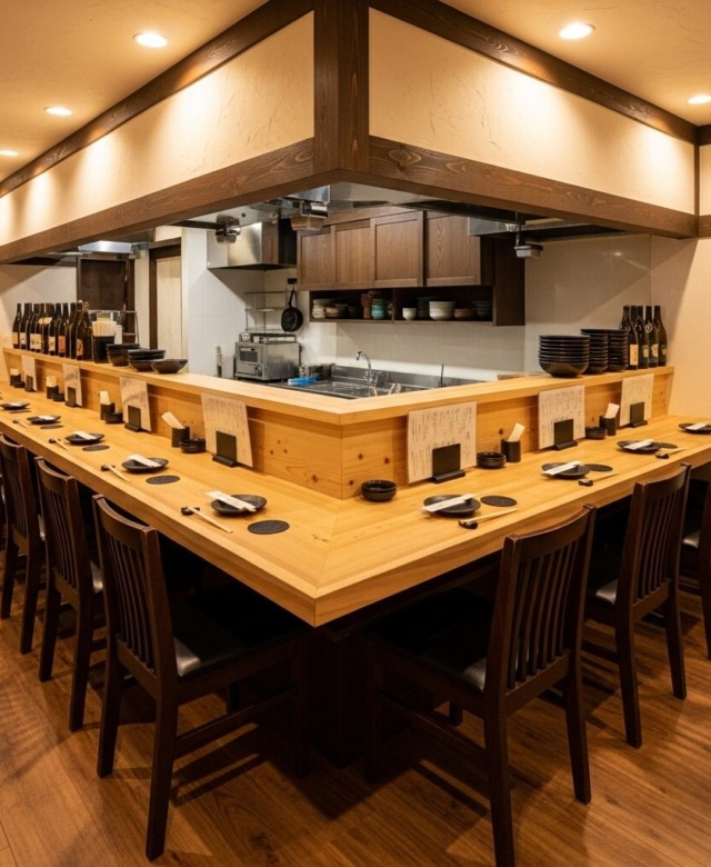 店内は和を基調とした空間で、カウンター席・半個室・宴会個室を完備し、2名から10名程度まで対応する席があり、貸切利用も相談可能である。